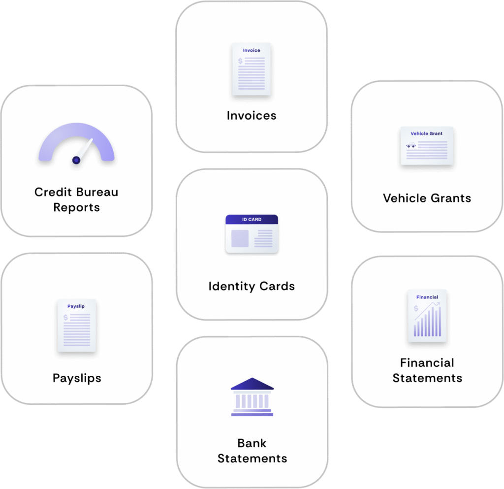 DocSuite supports a wide range of document types: bank statements, payslips, identity cards, invoices, financial statements, credit bureau reports and many more.